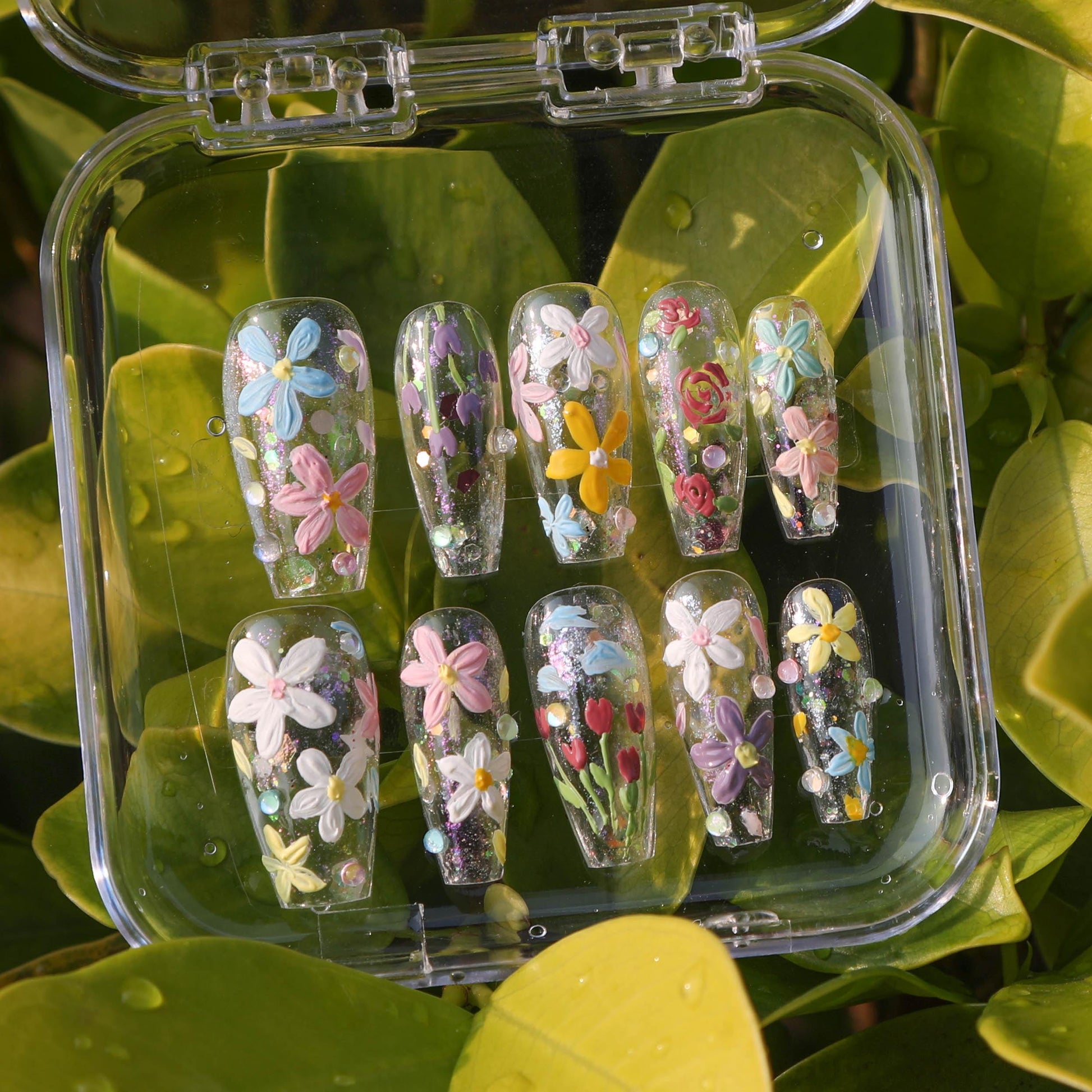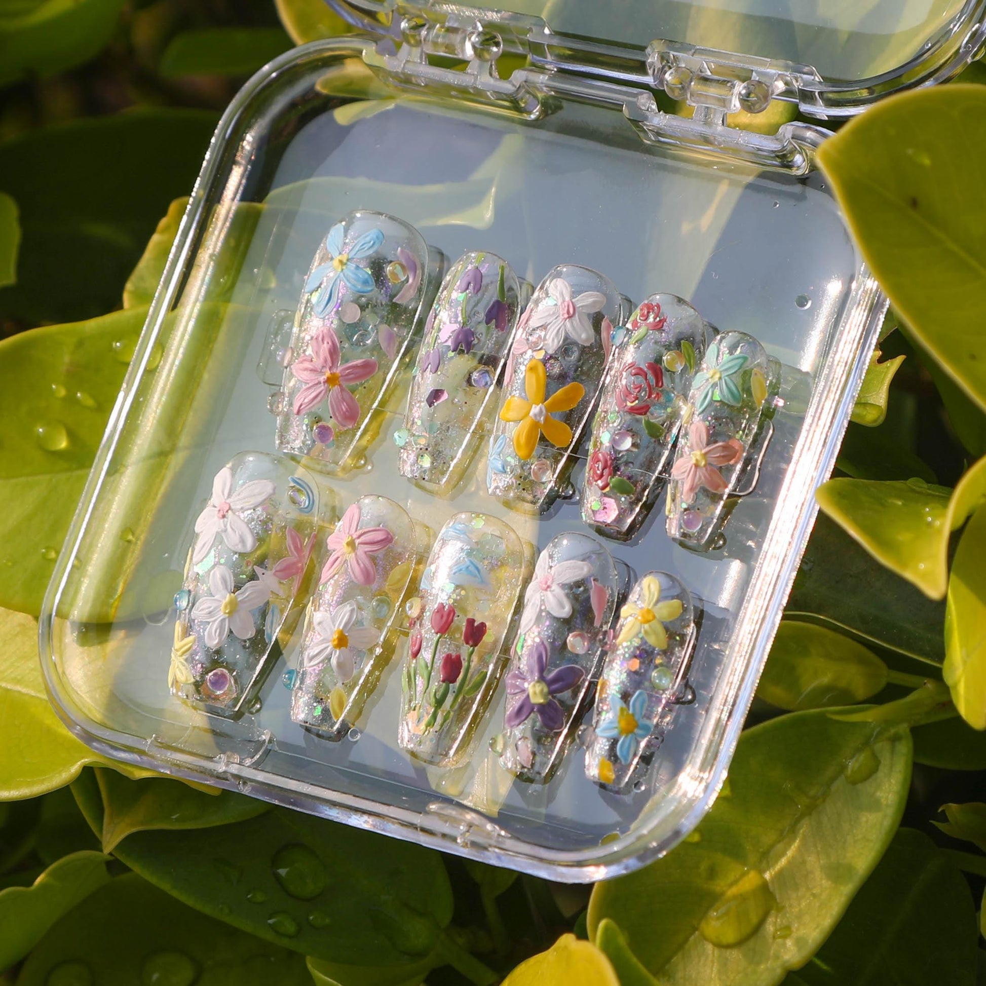 Bring spring to your fingertips with our 3D Floral Garden Press On Nail Set. This enchanting design features hand-sculpted flowers in pastel tones layered over a crystal-clear base with shimmering glitter. Each nail is adorned with miniature blossoms—daisies, tulips, and wildflowers—crafted in vibrant 3D for a lifelike garden aesthetic. Whether you're celebrating a wedding, picnic, or just your love for nature, this set turns every hand gesture into a bloom of beauty.