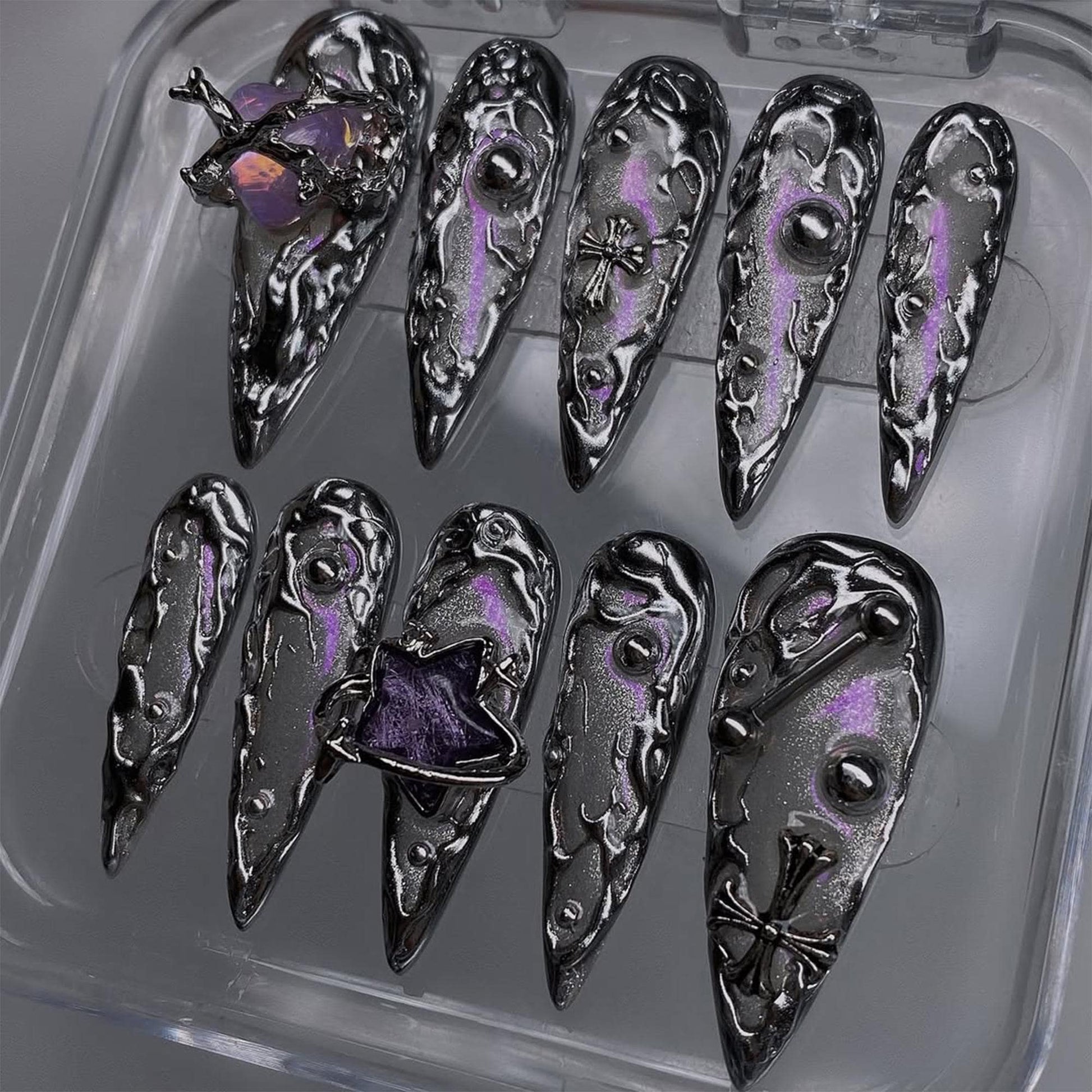 Unleash your dark side with our Gothic Chrome Purple Flame Press On Nails Set. This edgy, high-drama design features sculpted black chrome textures with molten effects, metallic spikes, and gothic charms like crosses, hearts, and safety pins. A mysterious purple shimmer runs through each nail, giving off an eerie, enchanted glow under the light.