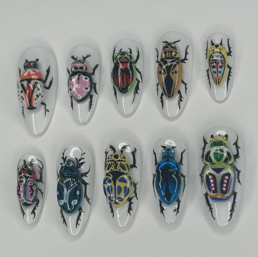 Colorful Insect Press On Nails with Artistic Beetle Hand Painting