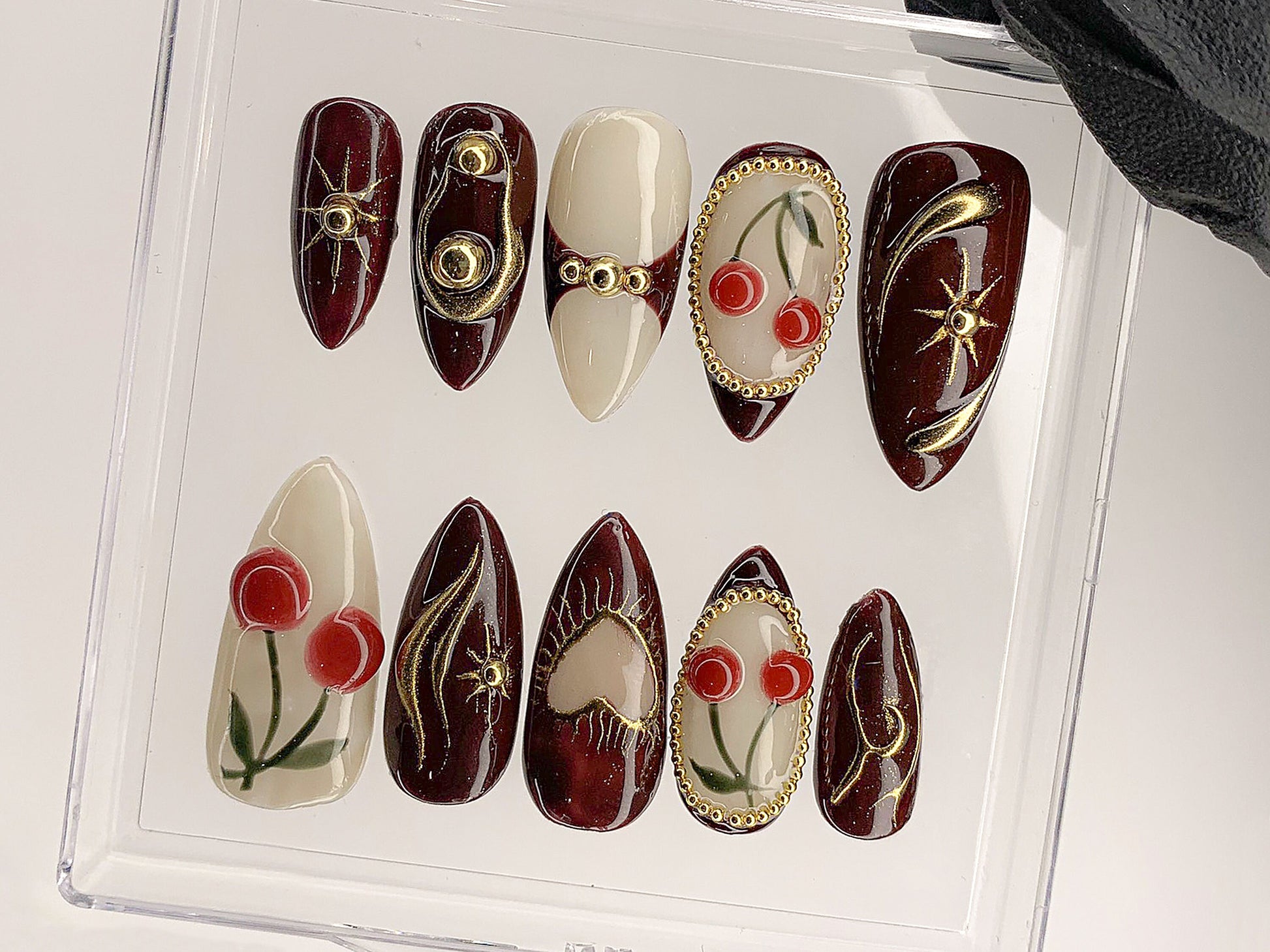 Indulge in sophistication with our Luxury Red Cherry Press On Nails, crafted for luxurious nail art lovers. These handcrafted press-ons feature stunning red cherry designs with gold leaf accents and delicate stems, set against a glossy black base. The stiletto shape offers a bold, elegant fit, while the UV finish ensures salon-quality shine and durability. Each nail is meticulously designed for a unique, high-end look.