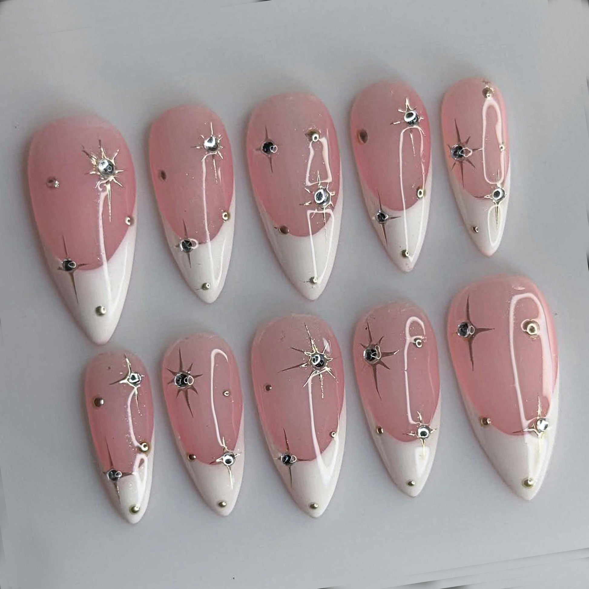 Step into effortless elegance with our Pink French Star Press On Nail Set, a refined blend of soft femininity and sparkling accents. These almond-shaped nails feature a classic nude-pink base with crisp white French tips, elevated by silver starbursts and crystal embellishments for a subtle, radiant touch.