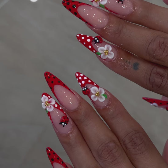 This Ladybug Floral Red Stiletto Press On Nails set features a playful handmade design inspired by ladybugs, garden flowers, and cheerful summer aesthetics. The color palette combines vibrant red, soft nude pink, crisp white, black polka dots, and fresh green leaf accents, creating a cute yet bold visual contrast. Each nail is carefully handcrafted with raised 3D gel details, including delicate white floral blossoms, miniature ladybug accents, dotted patterns, and smooth glossy finishes. The stiletto shape enhances the elegance of the design while adding a dramatic, fashion forward edge. The glossy top coat protects the artwork and enhances shine, keeping colors vivid and details crisp. This set is perfect for spring and summer styling, vacations, photoshoots, festivals, and statement everyday looks. Handmade with salon grade gel materials, these press on nails are durable, reusable, and comfortable for extended wear.