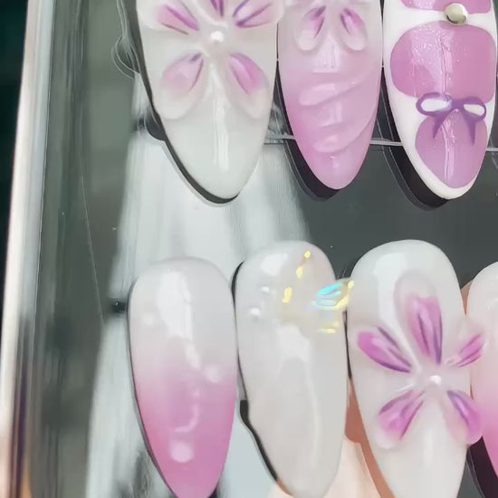 Each nail showcases hand-sculpted 3D flowers, twinkling rhinestones, and a milky white base dusted with iridescent sparkle. The subtle purple-to-white fades and light-catching gloss offer a look that’s feminine, serene, and polished. Perfect for garden parties, bridal events, or simply expressing your love for florals.