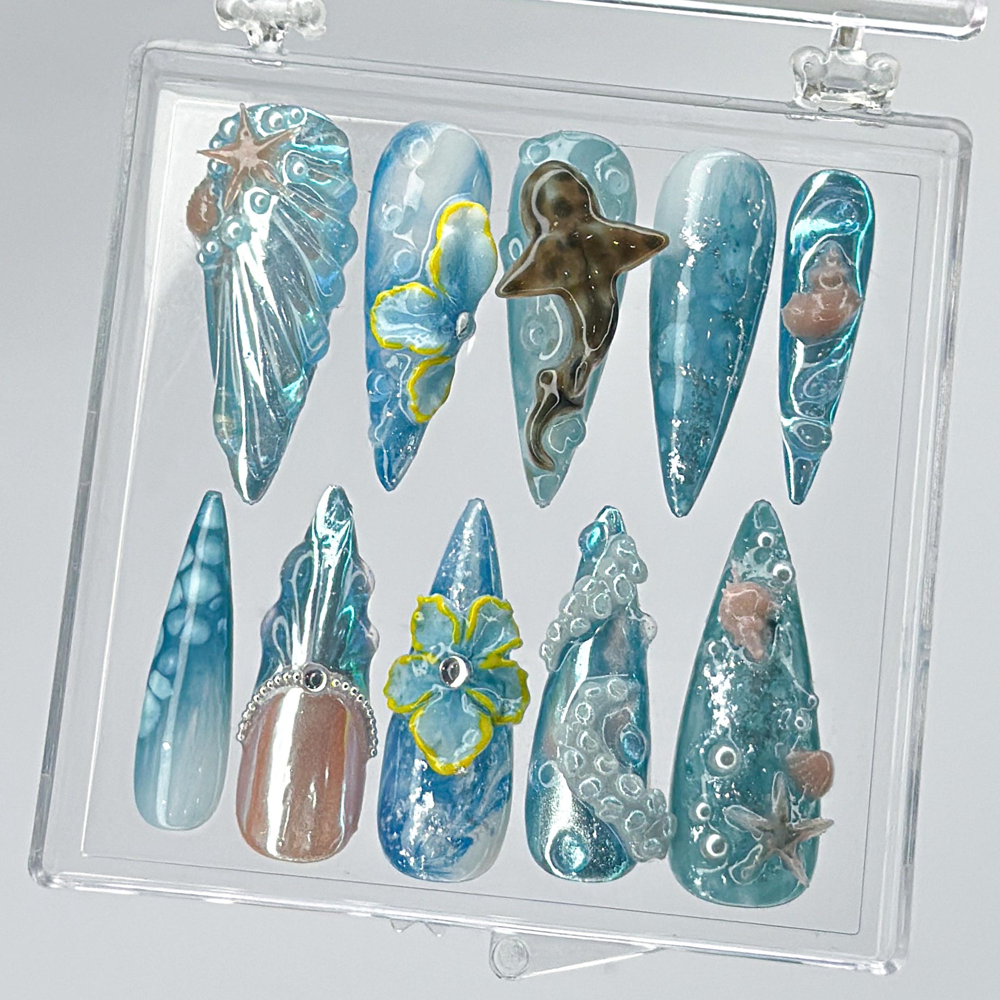 Dive into an underwater dream with our Luxury Mermaid Ocean Press On Nail Set. This enchanting collection features a mix of pearlescent blues, iridescent chrome, and translucent seafoam green tones. Handcrafted with detailed 3D sea elements like starfish, corals, seashells, and shimmering bubbles, each nail mimics the mystical beauty of ocean depths.