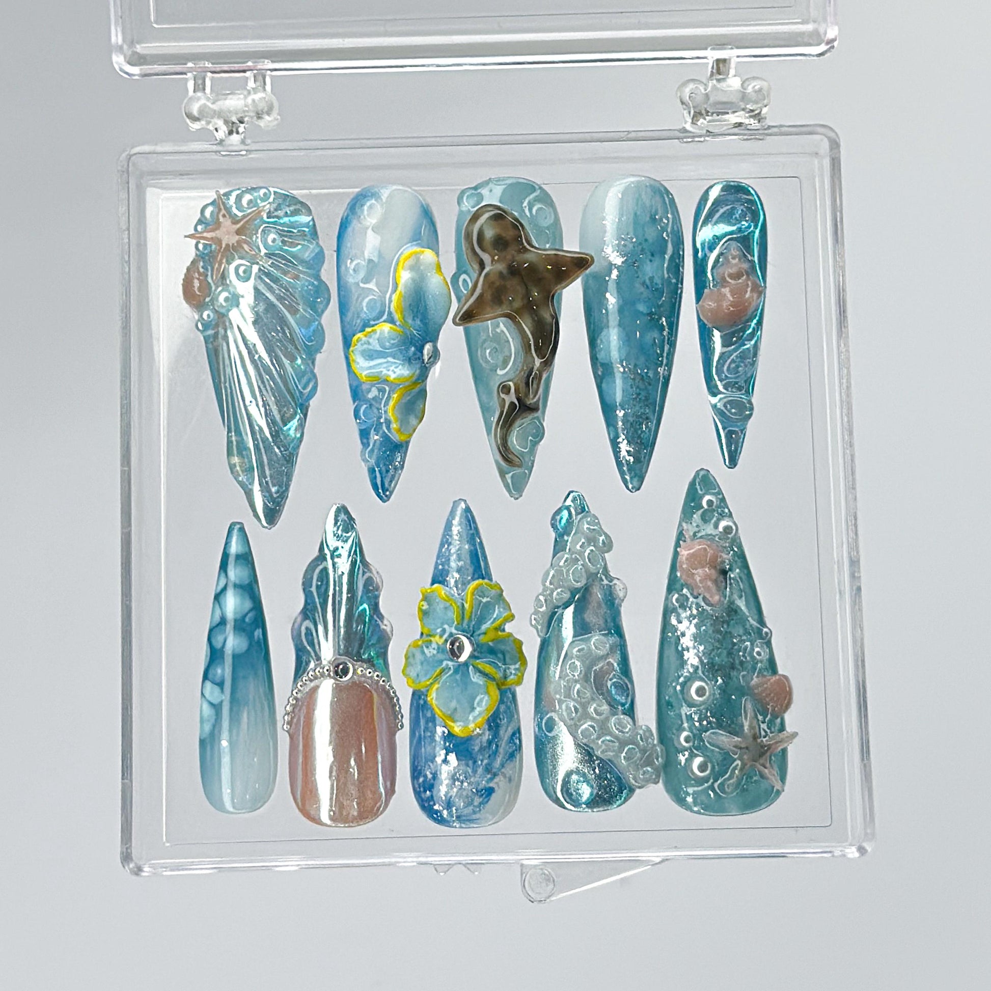Luxury Mermaid Ocean Press On Nails Set with 3D Seashell Art