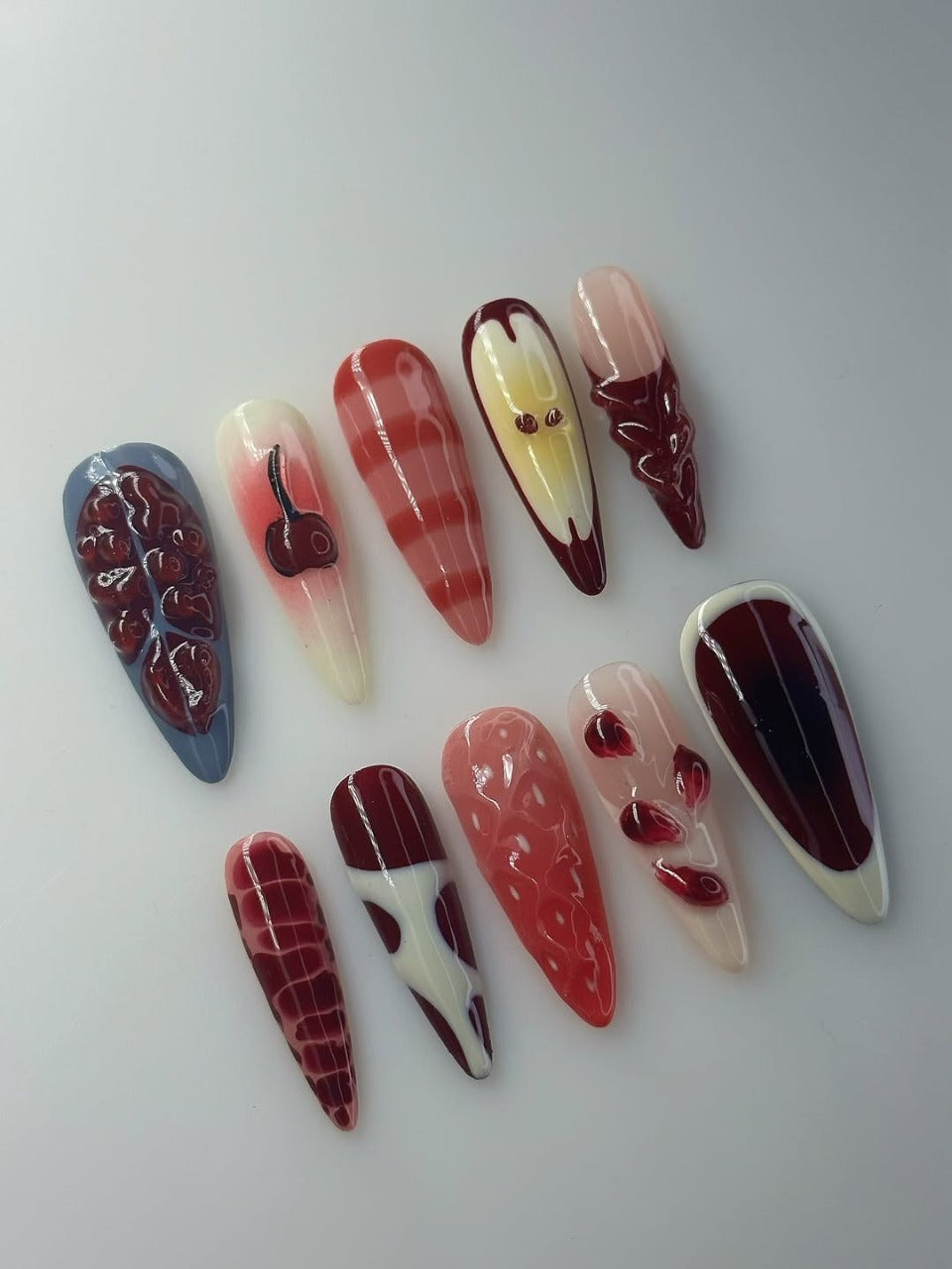 Each nail features a distinctive design: a playful cherry illustration, soft red-and-white gradients, bold pink stripes, glossy 3D textures, and abstract red droplets. The balance of deep burgundy, coral pink, ivory white, and smoky gray gives this set a fashionable yet artistic edge.