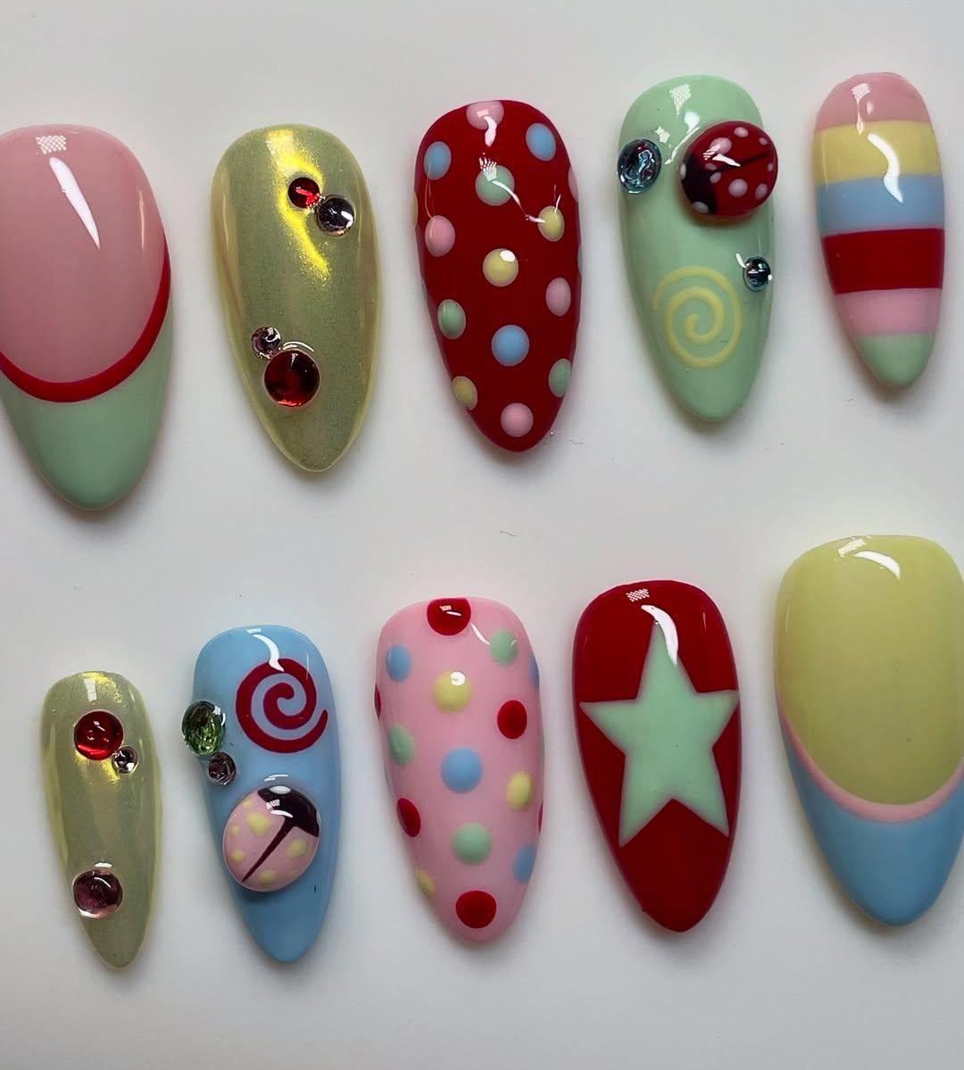 Perfect for parties, holidays, or whenever you want to express your bold and creative spirit, this nail set blends nostalgic charm with a modern twist. From glossy red bases to buttery yellow, mint green, and bubblegum pink, every nail adds a splash of color to your look.