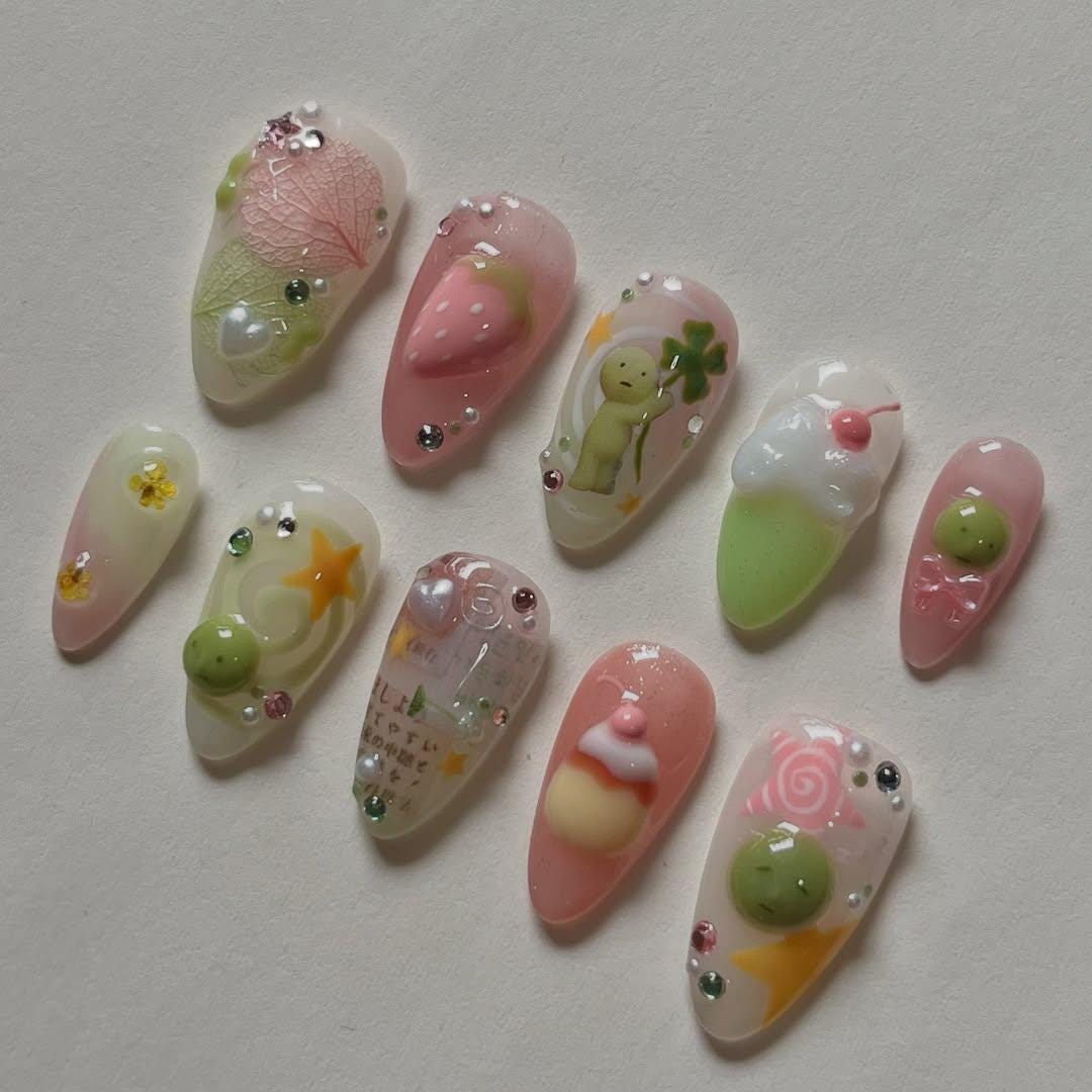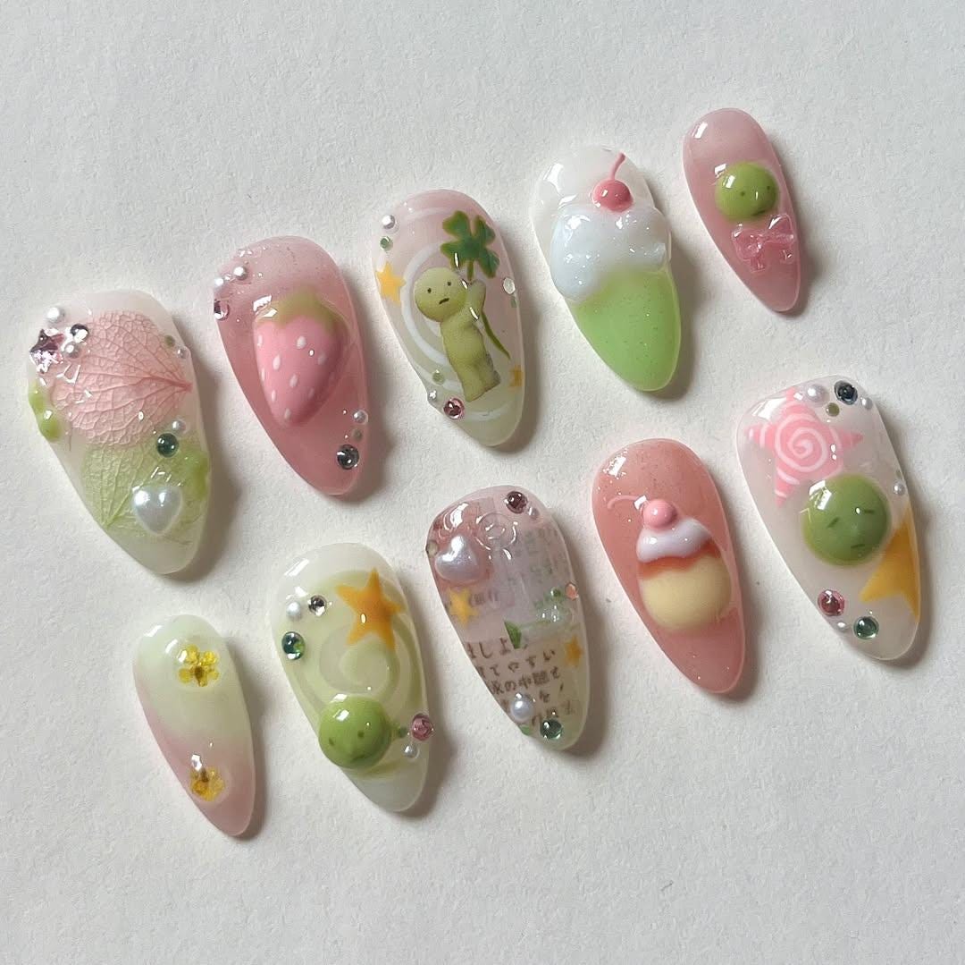 Elevate your style with our stunning 3D Kawaii Nail Art Set! This exquisite collection features a delightful array of pastel-colored nails, each adorned with intricate handcrafted details that bring a whimsical charm to your fingertips. Perfect for nail art enthusiasts and anyone looking to add a touch of fun to their look, this set showcases beautifully sculpted designs including juicy strawberries, adorable green characters, and creamy dessert-inspired accents. Each nail is accented with sparkling rhinestones and delicate embellishments, ensuring a luxurious and eye-catching finish.