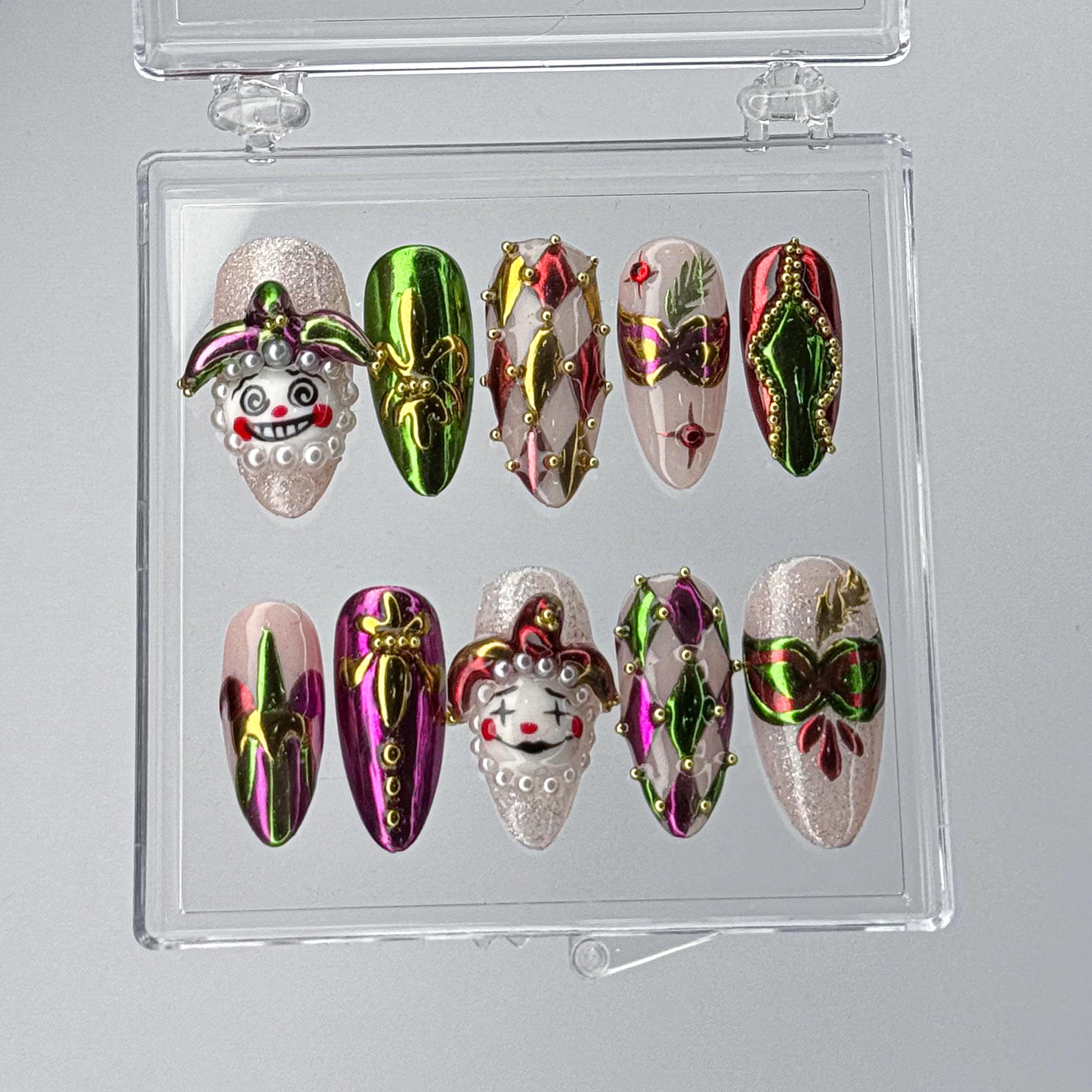 Whether you're celebrating Mardi Gras, attending a costume party, or simply love festive nail art, these nails are a must-have accessory. The playful jester faces and luxurious detailing make them a unique addition to your collection, guaranteed to turn heads and spark conversations. Pair them with your favorite masquerade mask or vibrant outfit to complete the look!