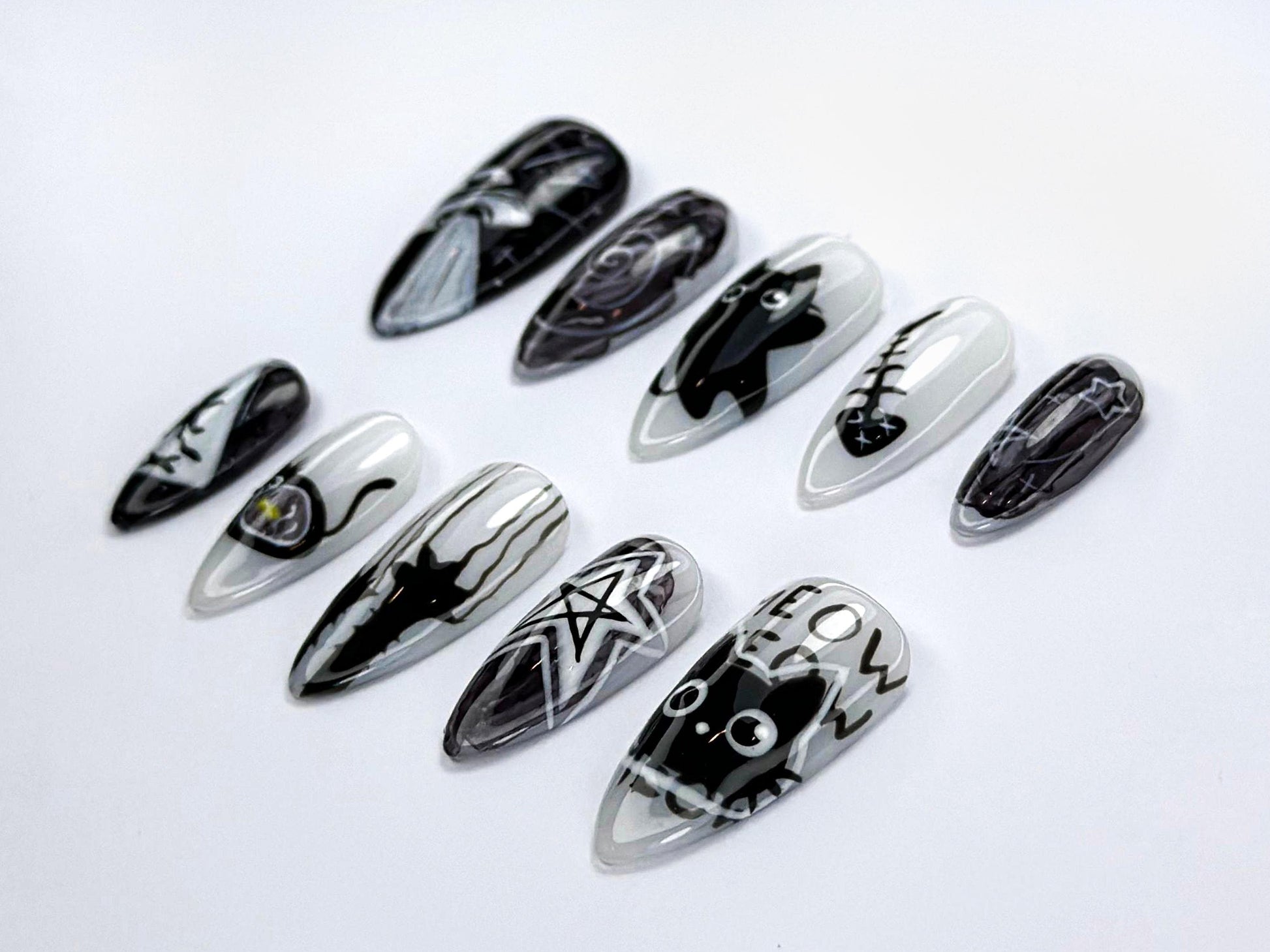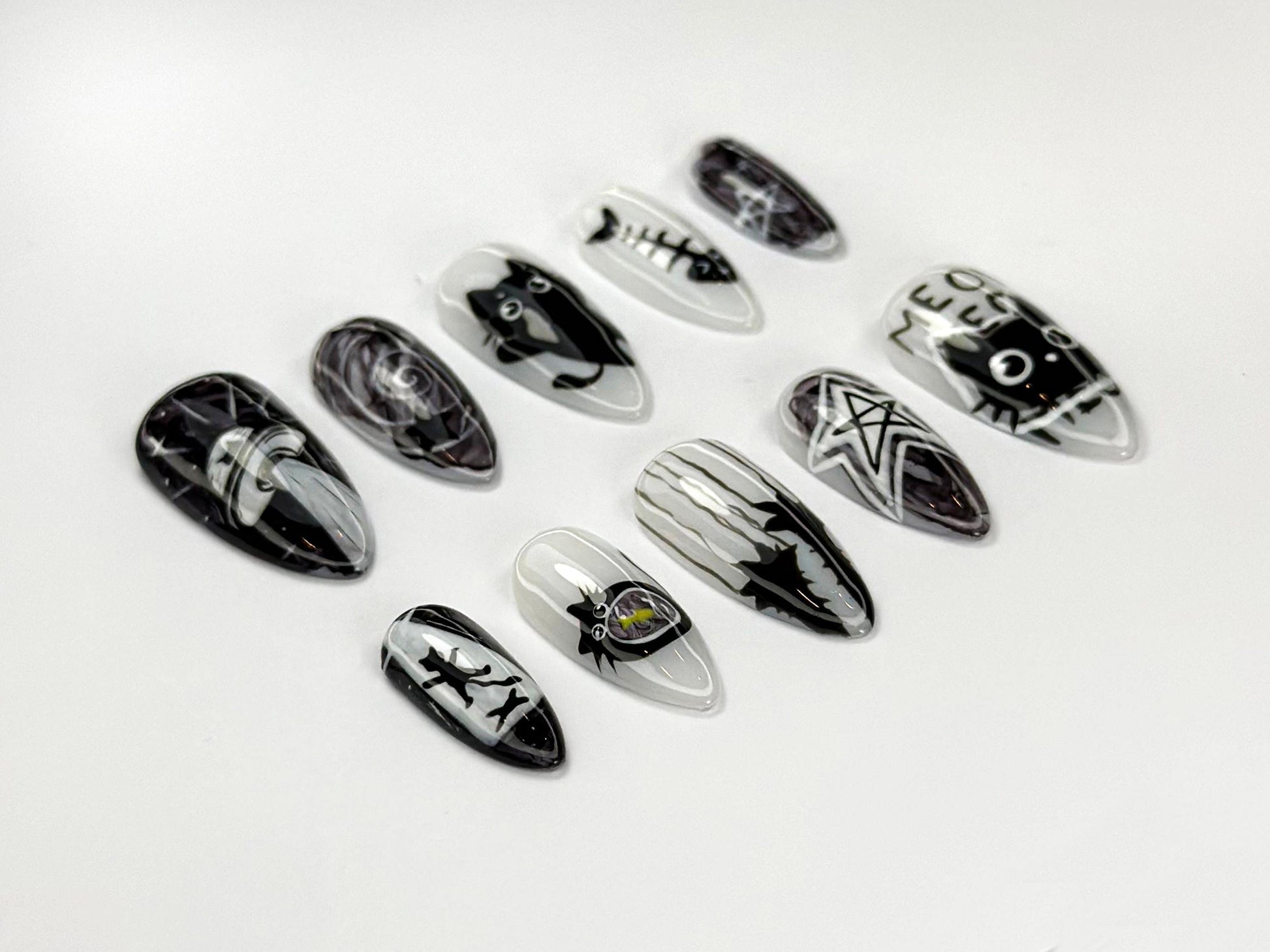 Unleash your inner mystic with this striking set of handcrafted press-on nails, designed for lovers of all things dark, magical, and mysterious. Featuring a bold monochrome palette of black, white, and shades of grey, this nail set is a perfect fusion of gothic charm and playful feline energy.
