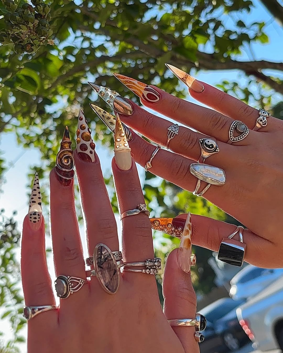 Every nail tells a different story through sculpted swirls, raised textures, glossy domes, abstract spots, tortoiseshell effects, and reflective gold finishes. The layered designs and mixed materials give the set depth and dimension, making each nail a wearable piece of contemporary art.