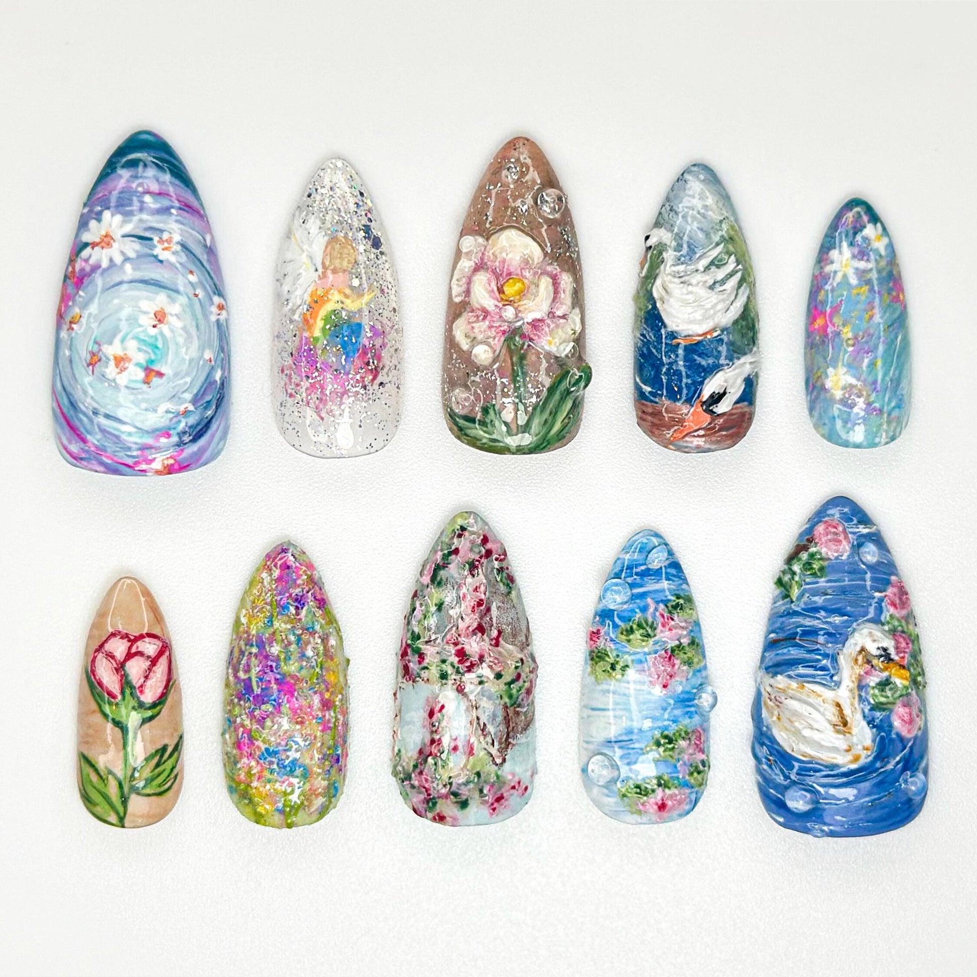 Unveil your fairytale fantasy with our Fairy Garden 3D Handpainted Nail Set. This enchanting set captures the whimsy of a magical garden with hand-painted elements like koi fish swirling in ponds, blooming roses, floating swans, glittery fairies, and dreamy florals. Each nail is a miniature canvas featuring textured 3D brushstrokes, layered colors, and pearl-like embellishments—perfect for those who appreciate detailed, artistic nailwear.