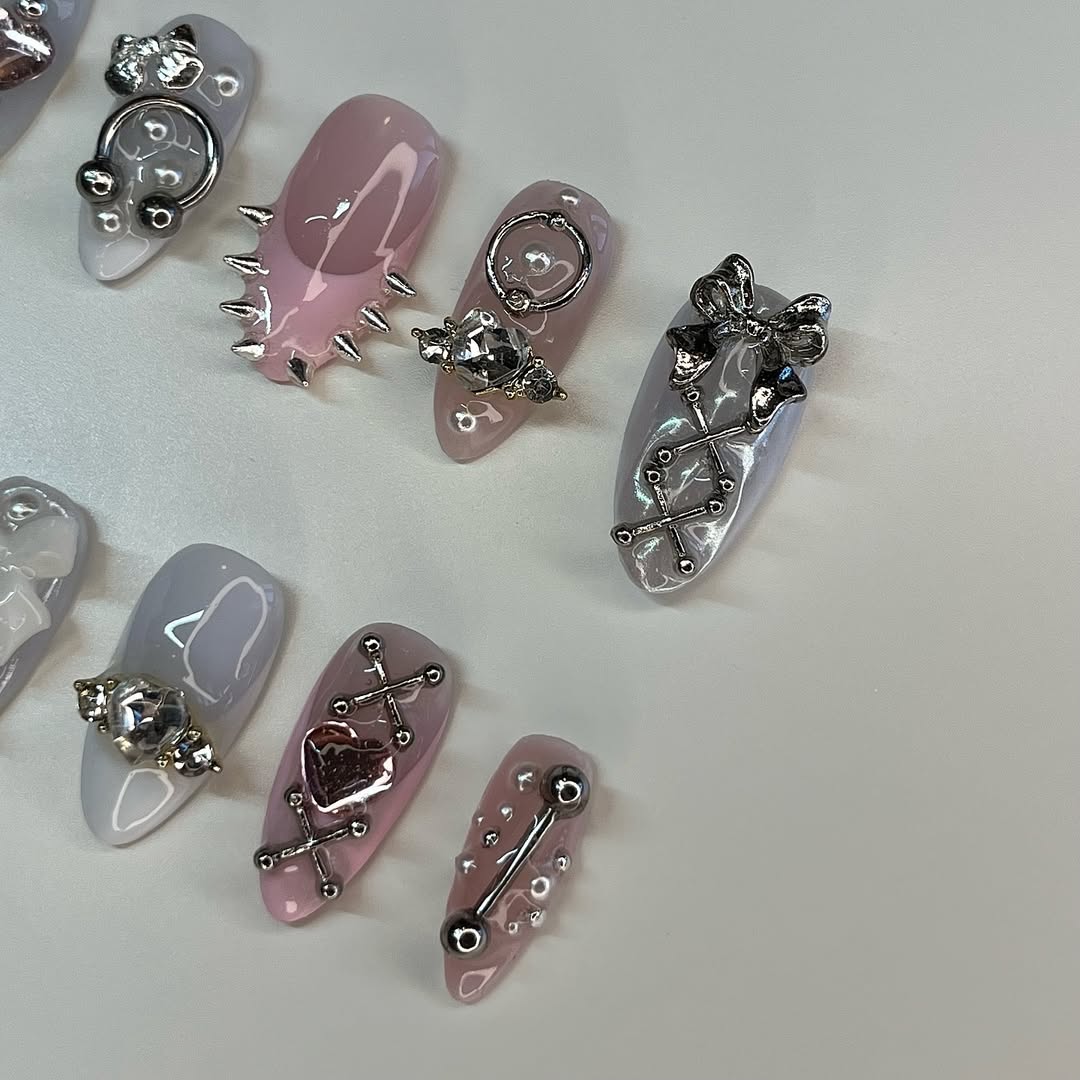 Handcrafted press on nails featuring pink and gray tones with silver metallic heart, cross, and bow details.
