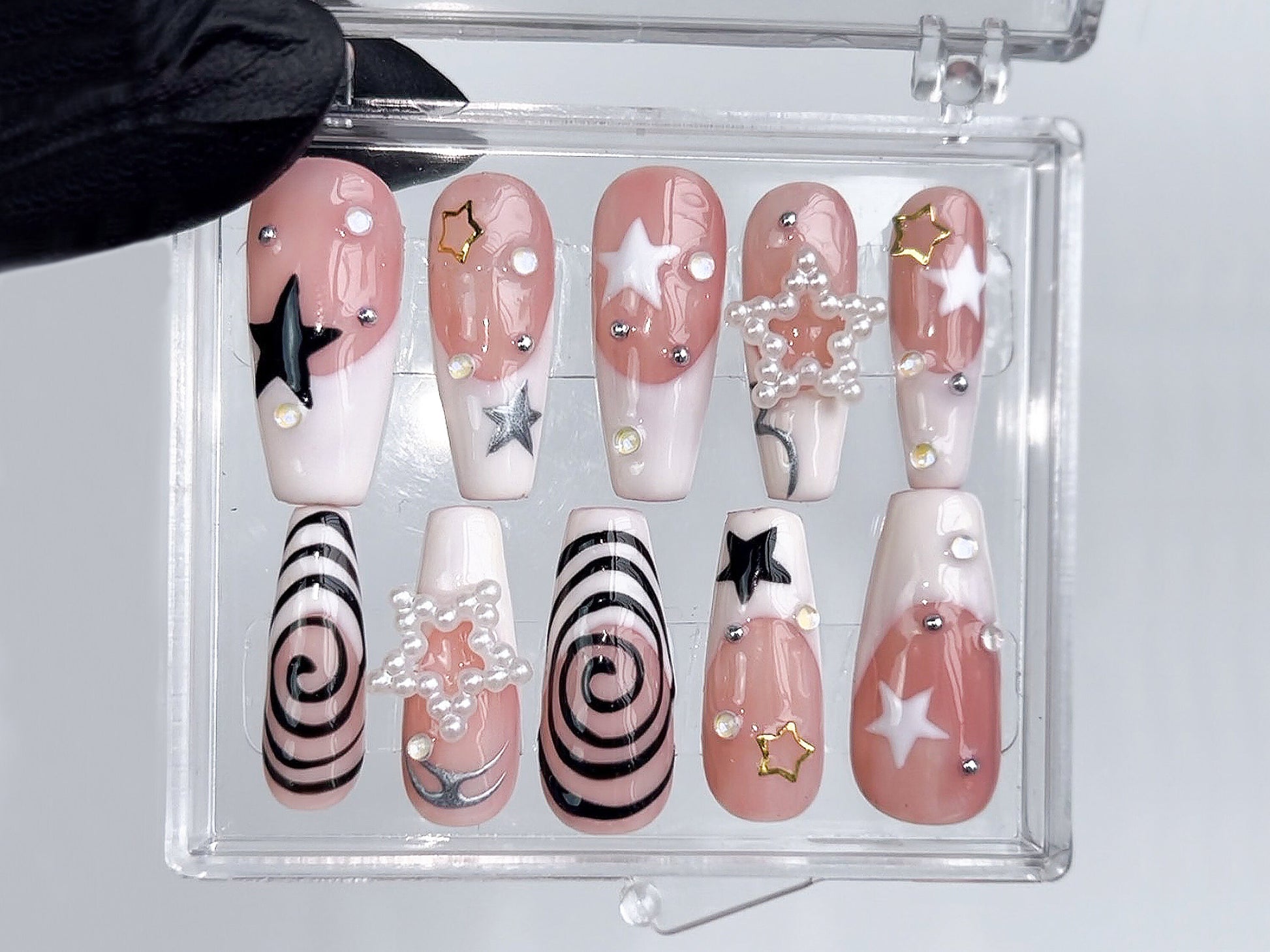 Featuring a delicate mix of pastel pink, white, and light gold tones, this handmade set brings soft elegance with a modern twist. Each nail showcases smooth gradients, subtle floral accents, and a glossy finish, inspired by a serene and feminine aesthetic. The gentle designs and soothing hues create a refined, understated look.