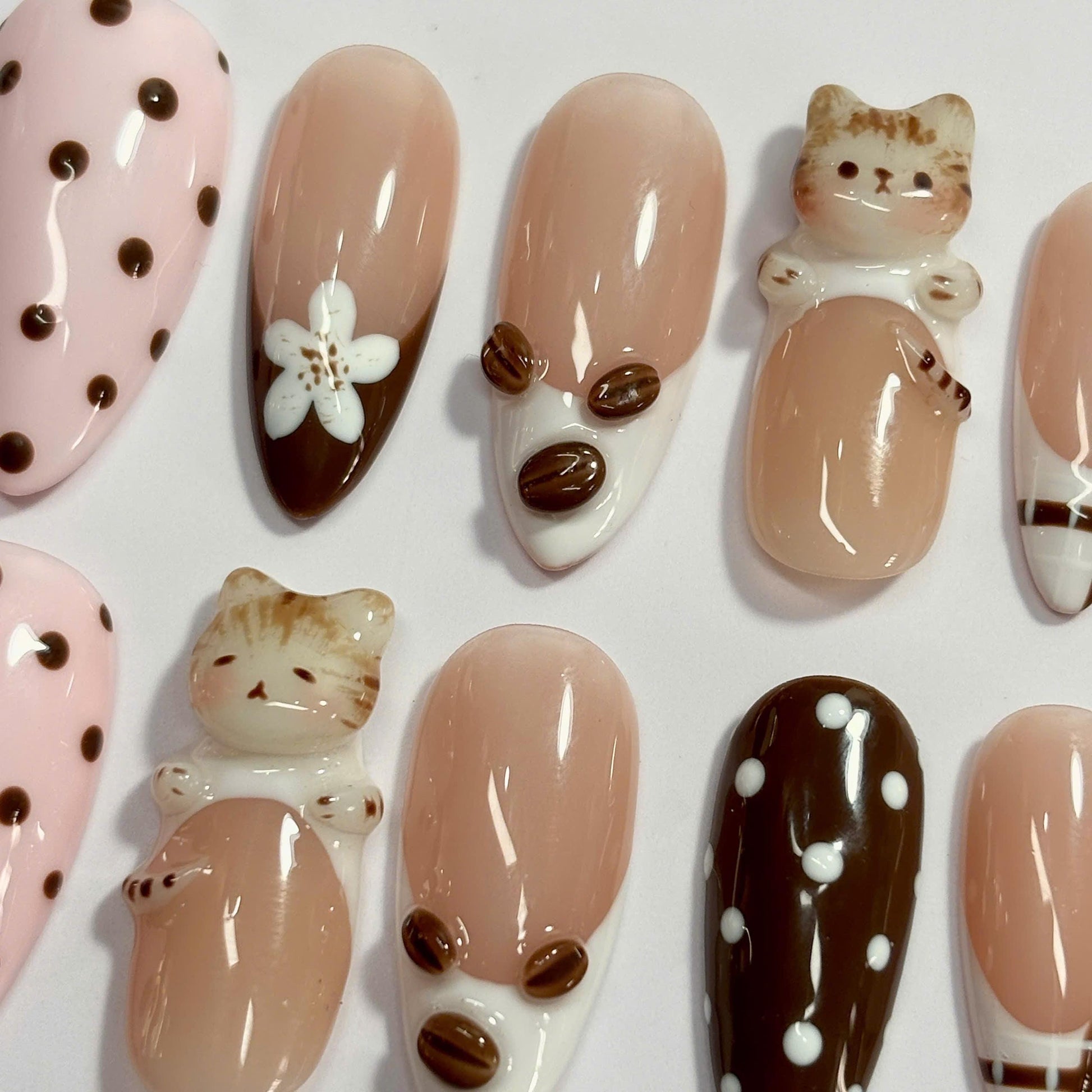 Coffee Cat Press On Nail Set Cute Brown Cream Style