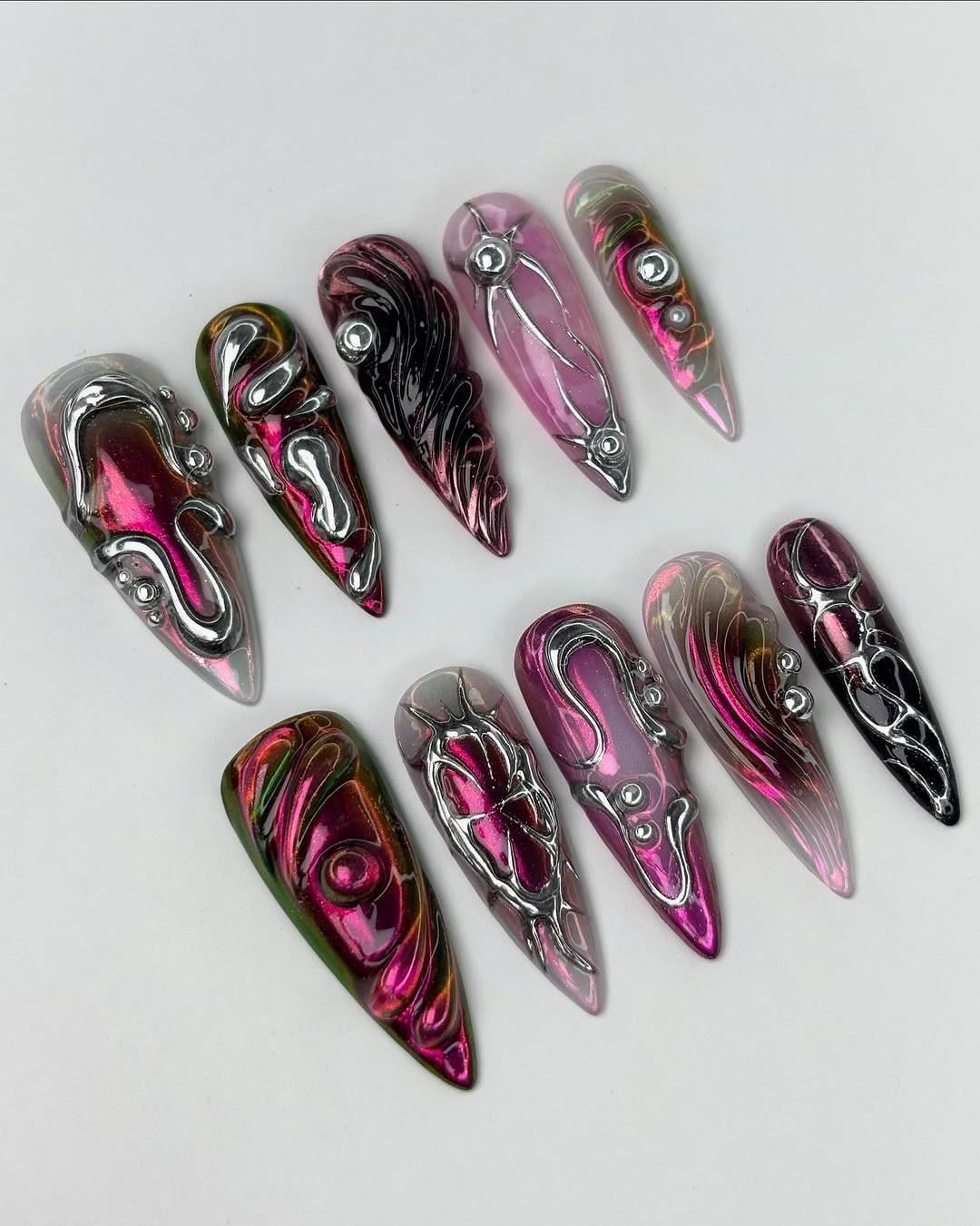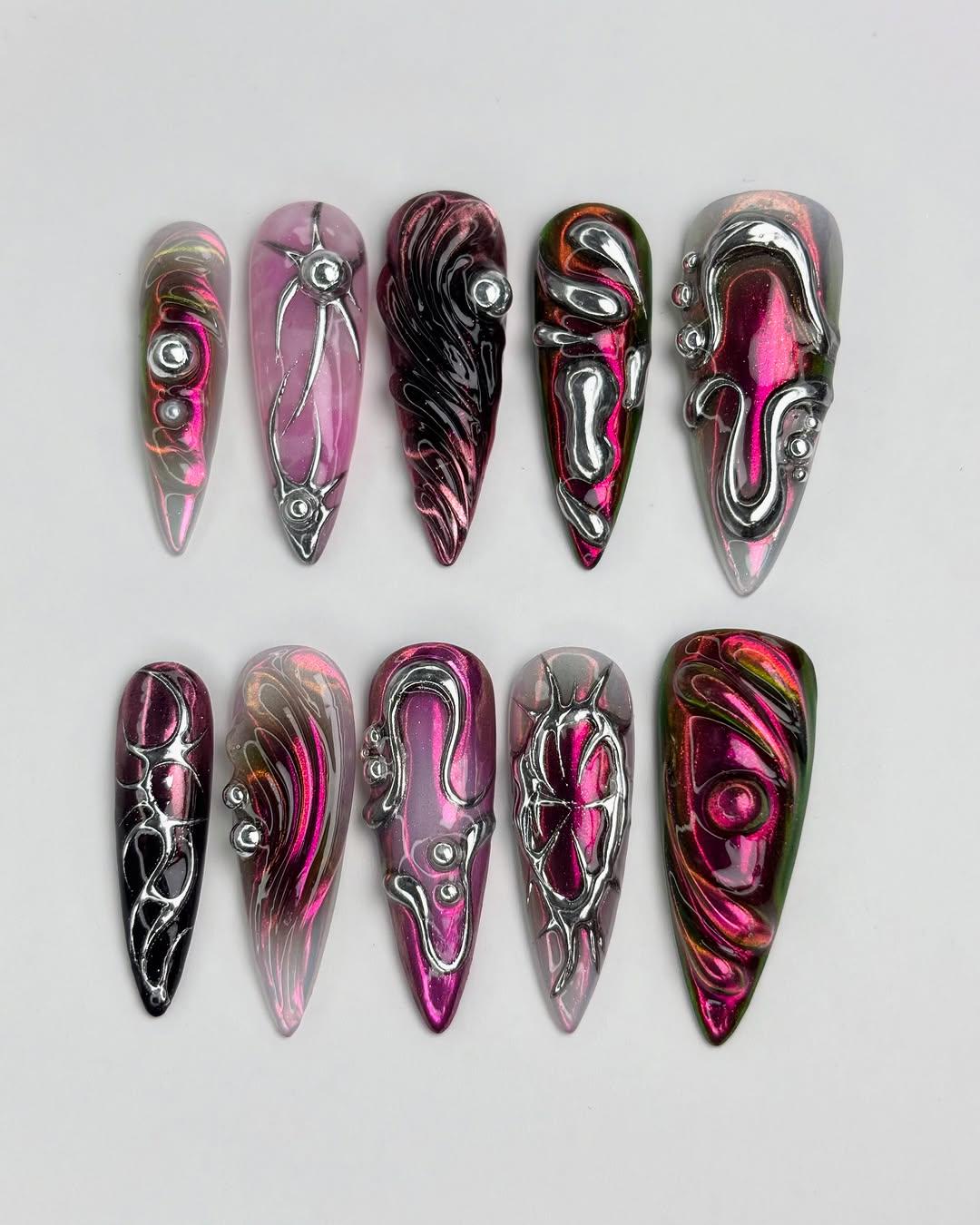 Unleash your inner edge with our Futuristic Chrome Pink Swirl Press On Nail Set. This high-impact nail design fuses bold metallic chrome overlays with deep magenta and electric black swirls, creating an otherworldly aesthetic. Each nail features handcrafted 3D elements, including silver droplets, abstract curves, and fluid ripple effects, delivering a sculptural, avant-garde look.