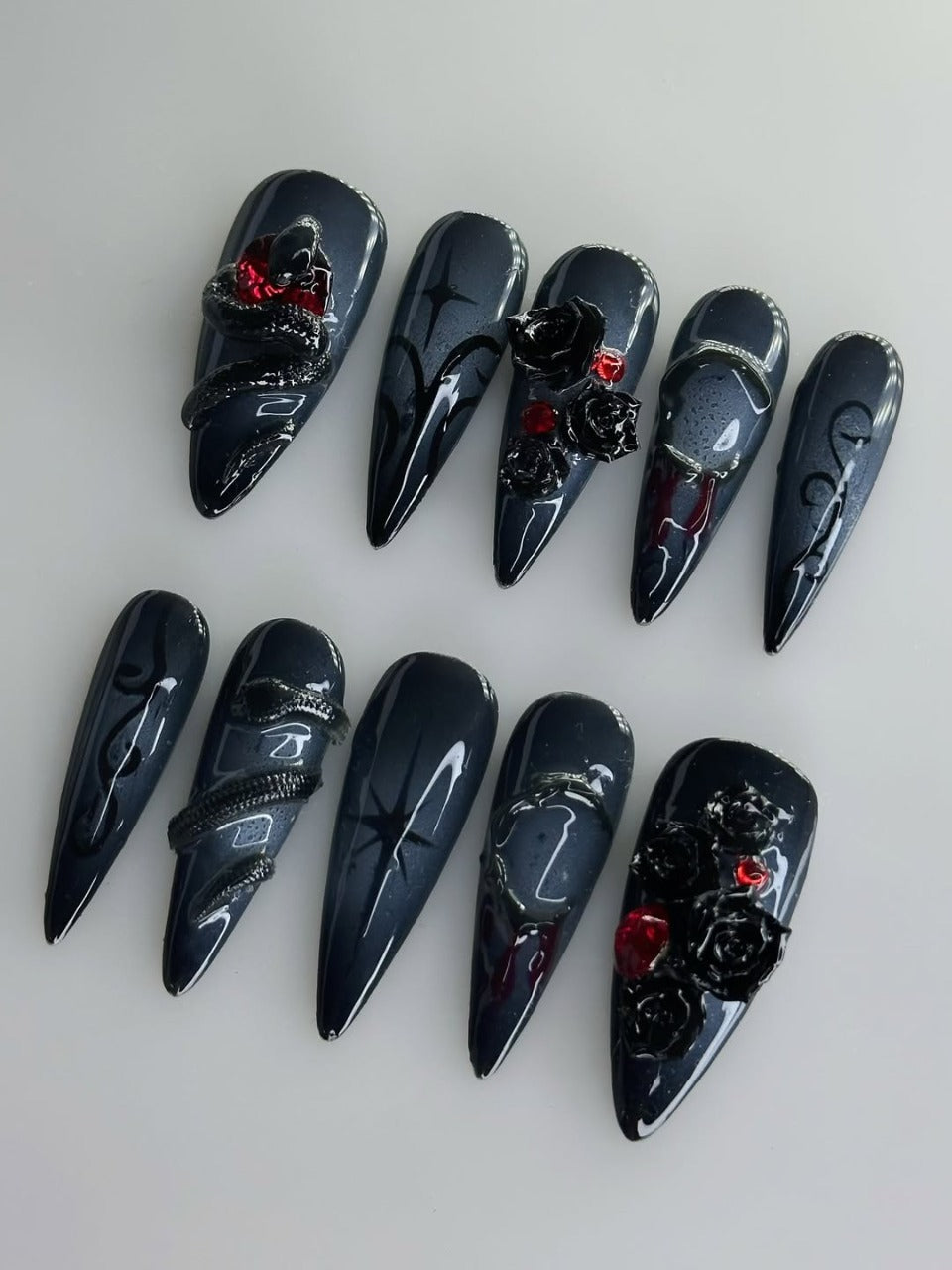 Each nail tells a story: 3D sculpted roses in deep black and crimson red, a coiled snake detail wrapping around, subtle star engravings, and glossy black swirls. The smoky metallic base enhances the dark romantic aesthetic, while the extra-long stiletto shape elongates the hands, making every gesture feel dramatic and powerful.