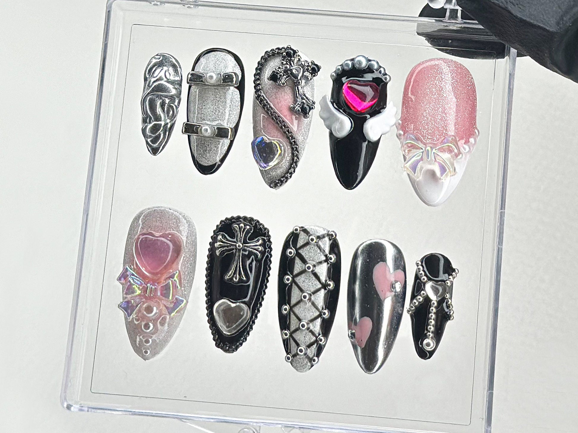 Step into your rebellious side with our Gothic Glam Press On Nails, where dark elegance meets romantic edge. This handcrafted set combines glossy black, shimmering silver, and soft blush tones to create a powerful visual statement. Inspired by alternative fashion and gothic charm, the design features corset details, angel wings, metallic hearts, and sculpted cross accents.