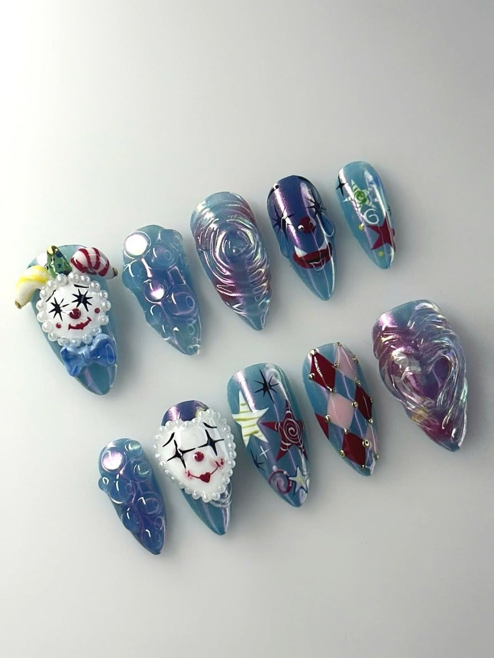The design features 3D clown faces with expressive details, swirling textures, raised heart accents, and carnival-inspired motifs. Complemented with star patterns, roses, and harlequin diamond prints, each nail is a miniature canvas full of personality and vibrant color.