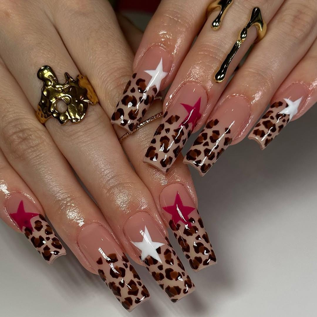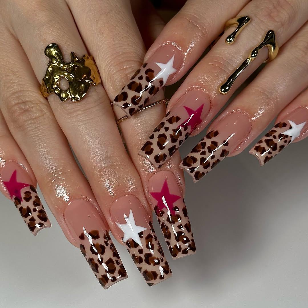 Each nail features a glossy nude base that transitions into a striking leopard tip, enhanced with a contrasting star for a touch of pop-art flair. The long coffin shape adds instant drama and elongates the fingers for a bold, modern look.