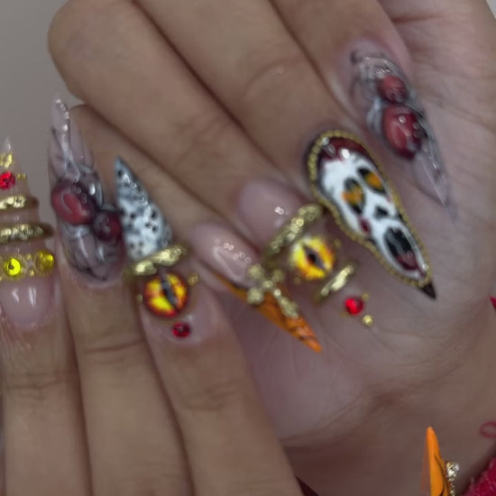 Step into the world of avant garde nail art with our Handcrafted Alien Eye Angel Gothic Abstract Press On Nails. This striking set is designed for those who love fearless fashion and bold self expression. Each nail is a miniature piece of art, featuring alien inspired fiery eyes, angelic motifs, metallic crosses, gemstone details, and abstract gothic accents that make every movement unforgettable.